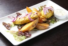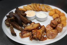 1150 г • колбаски гриль, бедро цыплёнка по-азиатски, куриные крылья, сырные палочки, креольский картофель, чесночные гренки, соус Блю-чиз, соус Айоли, соус BBQ