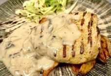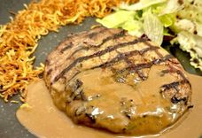 335 г • сочный бифштекс из говядины обжаренный на гриле, с дольками картофелеля и грибным соусом