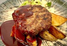 335 г • фирменный бифштекс из оленины зернового откорма, обжаренной на гриле, с вишнёвым соусом и запечённым картофелем
