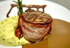 340 г • В ароматном беконе с соусом jack daniel’s и картофельным пюре со шпинатом
