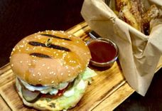 480 г • фирменная котлета из говядины, сыр Чеддер, томаты, маринованные огурцы, лук, салат айсберг. Подаем с запечённым картофелем и соусом